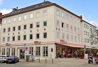 | An einer Ecke des Königsworther Platzes in der Calenberger Neustadt von Hannover steht das Anfang der 1960er Jahre errichtete „Haus Deutscher Osten“ unter der Adresse Königsworther Straße 2 in 30167 Hannover. Das Gebäude, hier zu sehen mit einer im Erdgeschoss neu eröffneten Filiale der Kette Café Extrablatt , ist unter anderem Sitz des Hilfskomitees der evangelisch-lutherischen Deutschen aus Polen ... | Eigenes Werk | Bernd Schwabe | Datei:Haus Deutscher Osten, Königsworther Straße 2, 30167 Hannover.jpg |