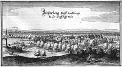 | Burgberg in einem Stich von Lauenstein, Niedersachsen, Deutschland aus dem Jahr 1654. Ausschnitt: Burgberg mit der Burg (Fürstliches Amtshaus). Grafik übernommen aus: Ulrich Baum: Lauenstein im Ith , Hrsg. Heimat- und Verkehrsverein e.V. Lauenstein, CW Niemyer-Druck, Hameln 1976 | Lauenstein-Merian-Stich-1654.png | Lauenstein-Merian-Stich-1654.png : Conrad Buno derivative work: Ukko.de ( talk ) | Datei:Lauenstein-Burgberg-Merian-Stich-1654.jpg | |