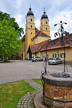 Die barocke Wandpfeilerkirche ist seit 1785 die Pfarrkirche hl. Katharina, sie steht in der nordwestlichen Ecke des Stiftgeviertes. Unter Propst Rosolenz wurde ein Westchor errichtet und danach der Hochaltar dort aufgestellt. Der Haupteingang ist seitdem im kleinen Kirchhof. Das mächtige Langhaus ist durch hochrechteckige Fenster, die früher rundbogig waren, und gemalte Lisenen gegliedert. Es ist von einem Satteldach bedeckt. Die beiden Türme sind Überreste der Fassade der romanischen Kirche, sie wurden um 1740 um ein achteckiges Geschoß und die Glockenstube erhöht. Die Türme sind mit Turmuhren ausgestattet und von welschen Hauben bekrönt.[5]
