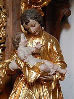 - Der Kreuzaltar ist der bedeutendste der Nebenaltäre. Er wurde um 1770 bis 1780 von Veit Königer angefertigt. In der Mitte befindet sich auf schwarzem Tuch eine Kreuzigungsszene mit Christus am Kreuz, Maria, Maria Magdalena, Johannes und der gute Schächer. Gottvater thront darüber auf goldenen Wolken, er ist von einem barocken Strahlenkranz umgeben.[13]