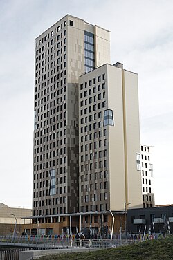 Das HoHo Wien ist ein Holz-Hybrid-Hochhaus in der Seestadt Aspern im 22. Wiener Gemeindebezirk Donaustadt. Mit 24 Geschoßen und 84 Metern Höhe ist es nach dem Ascent MKE in Milwaukee, Wisconsin, USA und dem Mjøstårnet im norwegischen Brumunddal das weltweit dritthöchste Holzhochhaus. Das HoHo Wien liegt auf einem 4.000 Quadratmeter großen Grundstück direkt an der U2-Station Seestadt sowie an einer angrenzenden Hochgarage.[1] Nach 1,5 Jahren Bauzeit wurde im März 2018 das Nebengebäude in gleicher Holz-Hybrid-Bauweise fertiggestellt. Im Jänner 2020 sind die ersten Gewerbe-Mieter ins Holzhochhaus eingezogen. Neben Büros beinhaltet es ein Hotel mit Serviced Apartments, ein Fitnessstudio und ein zum Hotel gehöriges Restaurant. Der äußere Holzanteil liegt ab dem Erdgeschoß bei 75 Prozent, in den Innenräumen bestehen die Decken, Wände und Holzstützen aus Fichtenholz.[2][3] Holzhäuser wie das HoHo Wien sind als Antwort auf den Klimawandel zu verstehen, seit Wissenschaftler wie Hans Joachim Schellnhuber vorschlagen, dass Holzhäuser eine Möglichkeit zur Speicherung von Kohlenstoffdioxid und damit für die zur Einhaltung des Zwei-Grad-Ziels erforderlichen negativen Treibhausgasemission sind.[4]