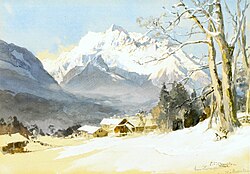 | Blick von Zwingerlehen am Kälberstein bei Bischofswiesen auf den Hochkalter , Bleistift und Aquarell auf Papier , 23,0 × 33,3 cm. | Reprografie aus Kunstbuch | Edward Theodore Compton | Datei:Compton bischofswiesen-hochkalter.jpg | |