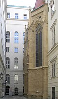 Die Hofburgkapelle ist die älteste und Hauptkapelle der Hofburg und war die Hauskapelle der Habsburger. Vermutlich um 1287/88 ließ Albrecht I. eine spätromanische Kapelle errichten, die urkundlich 1296 erstmals erwähnt wurde. Von 1423 bis 1426 erfolgte unter Albrecht V. eine Erweiterung; das Holz des aktuellen Dachstuhls stammt aus dem Jahr 1421. Albrecht, der in diesem Jahr eine großangelegte Judenverfolgung in Wien in Auftrag gab, veranlasste wahrscheinlich auch, dass in das Fundament der Kapelle jüdische Grabsteine eingelassen wurden (sie wurden später entfernt und in einem jüdischen Friedhof aufbewahrt).[8]