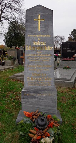 | Wiener Zentralfriedhof - Gruppe 12A, Reihe 3, Nr. 10: Grab des Notars und Politikers Dr. Andreas Edlen von Hofer (1833–1881). Er war einer der Söhne des Johann Edlen von Hofer (1794–1855), k. k. Tabakhauptverlegers in Fischamend, des einzigen Sohnes des Tiroler Freiheitskämpfers Andreas Hofer (1767–1810). | Eigenes Werk | PicturePrince | Datei:Wiener Zentralfriedhof - Gruppe 12A - Andreas von Hofer (1).jpg |