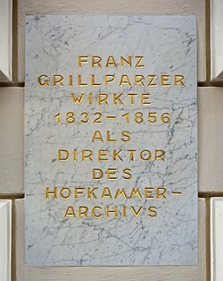 Das erstmals 1578 erwähnte Hofkammerarchiv ist das älteste der Wiener Zentralarchive.[8] Zunächst wurde das Archiv, das 1694 Zuwachs durch die Einverleibung der Bestände der vormaligen Niederösterreichischen Kammer und 1753 jener des einstigen Vizedomamts erhielt, in entsprechend adaptierten Räumlichkeiten im Nordtrakt des Kaiserspitals untergebracht. 1755 wurde es teils in die Wipplingerstraße (Österreichisch-Böhmische Hofkanzlei), teils in die Himmelpfortgasse (Winterpalais des Prinzen Eugen) transferiert, kehrte jedoch 1777 mit allen seinen Beständen wieder ins Kaiserspital zurück. Nachdem 1833 zusätzliche Räume im Kleinmariazeller Hof in Anspruch genommen worden waren, trat an dessen Stelle (nach der Demolierung des Hofes 1842) ein Archivneubau von Paul Sprenger, in dem 1848 das gesamte Hofkammerarchiv untergebracht wurde,[25] das sich in der Johannesgasse 6 befand, in dem sich heute das Literaturmuseum der Österreichischen Nationalbibliothek befindet. Franz Grillparzer, österreichischer Dramatiker und Archivar, war in den Jahren 1832–1856 Direktor des Hofkammerarchivs bzw. des Archivs des k.k. Finanzministeriums. Im zweiten Stock befindet sich das sein ehemaliges Arbeitszimmer. Das Direktionszimmer Grillparzers ist Bestandteil des Literaturmuseums.