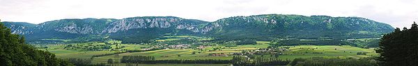 | Ansicht der Hohen Wand von einer Wiese nahe Unterhöflein. | Stitched from photos taken myself | Michael Schmid | Datei:Hohe Wand-West Pano.jpg |