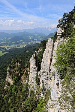 Die Hohe Wand im südlichen Niederösterreich ist ein ausgeprägtes Karstplateau von 8 km Länge und einer Breite von 2,5 km, das eine Höhenlage von 900 bis 1000 m aufweist und im Plackles (1132 m ü. A.) kulminiert.