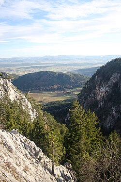 | Der westliche Teil der Hohen Wand mit steil nach Süden abfallenden Felswänden, in der Bildmitte die Hochfallwand | ||