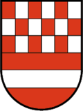 Der Gemeinde wurde 1929 folgendes Wappen verliehen: Ein geteilter Schild. Die obere Hälfte ist in drei Reihen zu je sechs Plätzen von Rot und Silber geschacht; das untere rote Feld wird von einem silbernen Balken durchzogen.[24]