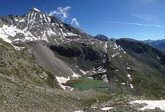 | Hoher Riffler mit Friesenbergsee und Friesenberghaus sowie Petersköpfl (2020) | ||