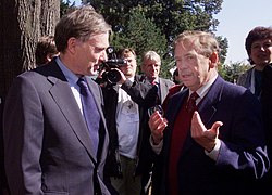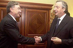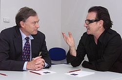 | Paul David Hewson (Bono) talking to IMF Managing Director Horst Köhler (later president of Germany) and discussing debt relief at the Prague Congress Centre in 2000. | IMF website | International Monetary Fund | Datei:Bono U2 with Horst Köhler at Prague 2000 IMF.jpeg | |