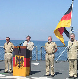 | Der damalige Bundespräsident Horst Köhler bei seiner Ansprache auf der deutschen Fregatte Mecklenburg-Vorpommern neben dem Generalinspekteur der Bundeswehr General Wolfgang Schneiderhan und dem Inspekteur der Marine Vizeadmiral Lutz Feldt. | Eigenes Werk | duke-z | Datei:Köhler-Bw-DJI.jpg |