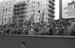 | Es folgt die historische Originalbeschreibung , die das Bundesarchiv aus dokumentarischen Gründen übernommen hat. Diese kann allerdings fehlerhaft, tendenziös, überholt oder politisch extrem sein. ADN-ZB/Mittelstädt/13.8.86 Berlin: Kampfappell. - Auf der Tribüne wurden der Generalsekretär des ZK der SED und Vorsitzende des Staatsrates der DDR, Erich Honecker, Vorsitzender des Nationalen Verteidigungsrates der DDR, und weitere Mitglieder der Partei- und Staatsführung begrüßt. In der Karl-Marx-Allee fand anlässlich des 25. Jahrestages der Errichtung des antifaschistischen Schutzwalls ein Kampfappell statt. | Dieses Bild wurde im Rahmen einer Kooperation zwischen dem deutschen Bundesarchiv und Wikimedia Deutschland aus dem deutschen Bundesarchiv für Wikimedia Commons zur Verfügung gestellt. Das deutsche Bundesarchiv gewährleistet eine authentische Bildüberlieferung nur durch die Originale (Negative und/oder Positive), bzw. die Digitalisate der Originale im Rahmen des Digitalen Bildarchivs . | Rainer Mittelstädt | Datei:Bundesarchiv Bild 183-1986-0813-054, Berlin, 25. Jahrestag zur Errichtung der Mauer.jpg | |