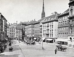 - ↑ Im Vergleich zur Plandarstellung aus 1896 (siehe #Bilder) fällt die neue Höhe des in der Aufnahme rechts anrainenden, später von Meissl & Schadn übernommenen und umgebauten Gebäudes auf.