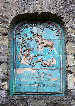 Ebenfalls südseitig und ebenerdig befindet sich eine blaue glasierte Tonrelief-Gedenktafel mit Inschrift und dem hl. Hubertus. Die Tafel wurde angeblich nach 1945 beschädigt und danach „zur Erinnerung an diese schwere Zeit“ in diesem Zustand belassen.[2]