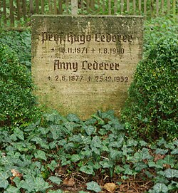 Seine Krankheit überschattete die letzten Lebensjahre und hinderte ihn an künstlerischer Tätigkeit. Die Korrespondenz mit dem Reichsministerium für Wissenschaft, der Reichskanzlei und der Akademie der Künste u. a. wegen der von ihm andauernd belegten Atelierräume führte 1939 gelegentlich Gattin Anny beziehungsweise Sohn Heinz.[56] Im Alter von 68 Jahren verstarb Lederer am 1. August 1940 an progressiver Paralyse im St. Franziskus-Krankenhaus in Berlin. Am 5. August fand in der Krankenhauskapelle eine schlichte Trauerfeier statt, es sprachen Pfarrer Schubert und Professor Amersdorffer. Propagandaminister Goebbels hatte einen Kranz gesandt.[57][58] Seine letzte Ruhestätte fand Hugo Lederer auf dem Wilmersdorfer Waldfriedhof Stahnsdorf, desgleichen 1952 seine Witwe Anny.