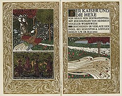 | Doppeltitel zu Hugo von Hofmannsthal: Der Kaiser und die Hexe . Berlin, Schuster & Löffler 1900. | http://www.kettererkunst.de/kunst/kd/details.php?obnr=411100319&anummer=379 | Heinrich Vogeler | Datei:Heinrich Vogeler Der Kaiser und die Hexe.jpg | |
