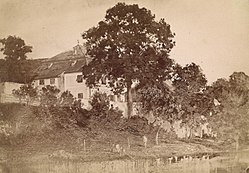 | Gut Osternberg bei Braunau, Wohnsitz des Malers Hugo von Preen. Im Vordergrund die Enknach. Fotografie auf Karton; Cabinet-Portrait J.F. Klinger, Braunau am Inn.Handschriftlicher Vermerk unter dem Bild "Osternberg im Innviertel. Besitz Preens".Das Gut Osternberg wurde 1970 von der Stadtgemeinde Braunau gekauft und im Dezember 1972 abgebrochen. An seiner Stelle wurde die HTL Braunau errichtet. | Historische Fotografie | Photoatelier Klinger Braunau | Datei:Preen Gut Osternberg.jpg |