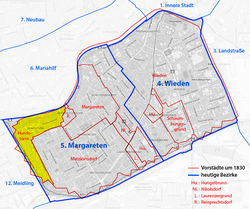 | Karte von Hundsturm, ehem. Vorstadt von Wien und dessen Lage in den heutigen Bezirken | Eigenes Werk , using OpenStreetMap data for the background Karte von Wien Wieden um 1830 von Carl Graf Vasquez-Pinas von Löwenthal | Maximilian Dörrbecker ( Chumwa ) | Datei:Karte von Hundsturm, ehem. Vorstadt von Wien und dessen Lage in den heutigen Bezirken.png | |