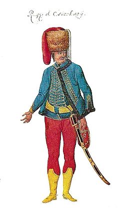 - 1767 Grüner Tschako, dunkelblauer Pelz, Dolman und Hosen, gelbe Knöpfe. Schnüre, Säbeltaschen und Schabracken ponceaurot