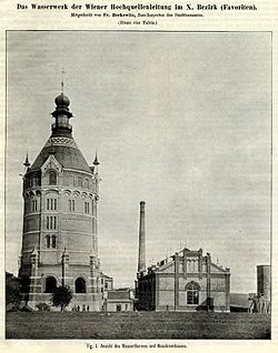 | Favoritner Wasserturm mit Maschinenhalle | Das Wasserwerk der Wiener Hochquellenleitung im X. Bezirke (Favoriten), Mitgetheilt von Fr. Borkowitz, Bau-Inspector des Stadtbauamtes, Sonderabdruck aus der Zeitschrift des Oesterr. Ingenieur- und Architekten-Vereines, 1900, Nr. 4, Wien, 1900, Im Selbstverlage des Verfassers | unbekannter Fotograf | Datei:GuentherZ 0002 Wasserturm Favoriten.jpg | |