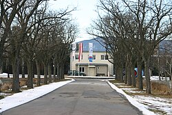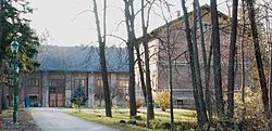 Das Hauptgebäude ist ein ehemaliges Wasseraufseherhaus, das unter Denkmalschutz steht. Der eingeschoßige Quaderbau mit Satteldach wurde 1875 errichtet und dokumentiert die gründerzeitliche Zweckarchitektur der Bauzeit. Das Erweiterungsgebäude wurde 1998 stilistisch angepasst beigestellt.[29][32]