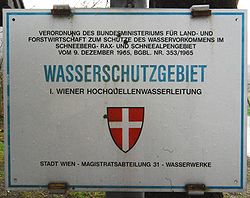 Schon 1965 wurde ein umfassendes Wasserschongebiet geschaffen, das Wasserschongebiet Rax–Schneeberg–Schneealpe (Schongebiet Nr. 3/4, BGBl. Nr. 353/1965).[22][11] Es umfasst Schneealpe, Rax, Höllental, Schneeberg, Gahns bis zum Sierningtal bei Stixenstein. Der Umfang des Schutzgebietes beträgt 18.354 ha,[23] davon 12.447 ha in Niederösterreich und 5.907 ha[24] in der Steiermark. Die Umgebungen der einzelnen Quellen sind im Radius von 500 Meter strenges Wasserschutzgebiet.