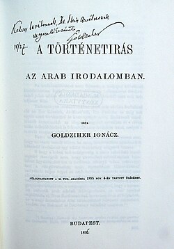 Nach seinen Auslandsstudien strebte Goldziher die Privatdozentur an der Universität Budapest an, die er nach anfänglichen Schwierigkeiten 1871 erhielt. Im September 1871 wurde er zur Probevorlesung geladen, deren Thema die Entwicklung der historischen Literatur bei den Arabern war. Als Habilitationsschrift erschien die Vorlesung in der Protestantischen Rundschau noch im selben Jahr.[14] Mit den Strömungen der Historiografie bei den Arabern beschäftigte sich Goldziher auch später und verarbeitete seine Habilitationsschrift in einer umfassenden Darstellung A történetírás az arab irodalomban (Die Geschichtsschreibung im arabischen Schrifttum), vorgelesen auf der Sitzung der Akademie am 4. November 1895.[15]
