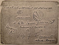 | Briefumschlag eines Briefes an Goldziher vo Hasanen Efendimit Titeln in arabischer Sprache. | Eigenes Werk | Orientalist | Datei:Umschlag(Goldziher).JPG |