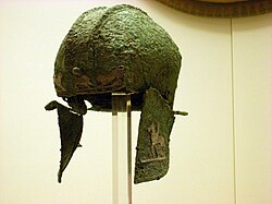 | Casque de type «illyrien» avec un décor appliqué en feuille d'argent. 530 avant J.C | Eigenes Werk | Muriel Pécastaing-Boissière pour Cédric Boissière | Datei:Casque illyrien.JPG | |