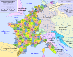 | Einteilung des Französischen Kaiserreichs in Départements im Jahr 1812. | Dep-fr.svg | Dep-fr.svg : Der ursprünglich hochladende Benutzer war ArdadN in der Wikipedia auf Englisch derivative work: Furfur ( talk ) | Datei:France L-1 (1812)-de.svg | |