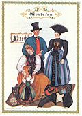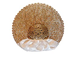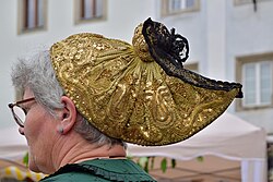 Vorarlberg | Die Bodensee-Radhaube zeichnet sich vor allem durch das aus Gold- oder Silberfäden auf beiden Seiten gefertigte Ornament aus. Sie wird auf der Vorder- und Rückseite in gleicher Qualität hergestellt und von Trachtenträgern rund um den Bodensee zu besonderen Anlässen, wie zum Beispiel Tanzvorführungen oder Festen sowie zu Repräsentationszwecken, getragen. | |