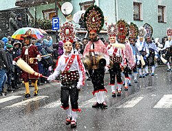 Seit 1958 ziehen am Unsinnigen Donnerstag in der Tiroler Ortschaft Patsch die in Zweierreihen aufgestellten Frauen durch den Ort und schlagen Glocken und Schellen im Rhythmus, der von einer Hexe vorgegeben wird. Die Schellenschlagerinnen tragen dabei eine hölzerne Maske, einen mit Federn, Trotteln und Blumen verzierter Hut, geblümte Schultertücher, mit bunten Bändern verzierte, weiße Hemden und Kniebundlederhosen. Die Schellen und Glocken werden von den Frauen hinter dem Rücken getragen und im vorgegebenen Rhythmus geschellt. Die Hexe beendet mit einem Signal mit dem Besen den Umzug, zu dessen Ende „ausgeschellt“ wird und alle Glocken noch einmal gleichzeitig erklingen. Die Kostüme werden in der Regel innerhalb der Familie von Mutter und Großmutter auf die Tochter vererbt. Bei den traditionell von Männern dominierten Tiroler Fasnachtsbräuchen stellen die Patscher Schellenschlagerinnen eine Ausnahme dar.[25] Termin: Unsinniger Donnerstag (Fasnacht) nächster Termin: 12. Februar 2026 |