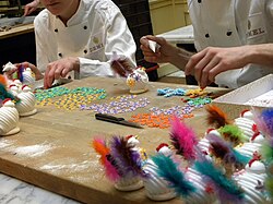 alle Bundesländer | Das Handwerk der Zuckerbäcker hat in Österreich seinen Ursprung in den überlieferten Traditionen aus dem Brot- und Lebkuchenbäckereien sowie den adligen Hof- und bürgerlichen Hotelküchen. Im Zuge der breiten Verfügbarkeit von Zucker wuchs die in der Bevölkerung die Vorliebe für Mehlspeisen und Gebäck, die damit zum festen Bestandteil der österreichischen Küche wurden. Die Herstellung der Süßspeisen beruht auf traditionellen Arbeitstechniken, wie beispielsweise das Ziehen und Spinnen von Zucker, die mit speziell auf die Bedürfnisse anfertigten Gerätschaften ausführt werden. Durch die Verbreitung der industriellen Massenproduktion von Backwaren gingen in den letzten Jahrzehnten in Europa die Anzahl von auf Zuckerbäckereien spezialisierten Betrieben deutlich zurück. Gegenwärtig sind in Österreich noch ca. 1300 Zuckerbäcker tätig. Das Wissen um die alte Handwerkskunst wird auf gemeinsamen Veranstaltungen und Wettbewerben weitergegeben.[25] | |