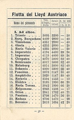 | List of ships of the Austrian Lloyd in 1898 (Almanacco di cuchina 1898, p. 38) | Eigenes Werk | Heied | Datei:Almanacco cuccina 38 WP.jpg | |
