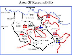 | Area of Responsibility for the Nordic Polish Brigade (NORDPOL BDE). The Brigade Headquarters were established on 8 February 1996 in the former barracks in the west side of Doboj, designated the North Pole Barracks. The whole Brigade was completely deployed and operational in mid-February, when the last element, the main body of the Finnish Construction Battalion arrived. The Brigade was designated the Nordic-Polish Brigade (NORDPOL BDE) on 10 February 1996. | http://www.1id.army.mil/NordAOR.htm | unknown, U.S. Army image | Datei:AOR NORDPOL Brigade 1996.jpg | |