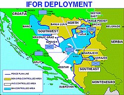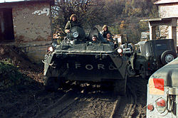 Nachdem am 15. Dezember 1995 der Sicherheitsrat der Vereinten Nationen in der Resolution 1031 die IFOR definierte und einrichtete, wurde die NATO beauftragt die Waffenstillstandsvereinbarungen sowie die Truppenentflechtung zu überwachen.[2] An diesem erstmaligen Einsatz der NATO, außerhalb der bisherigen Rolle als kollektives Verteidigungsbündnis, beteiligten sich 16 NATO- und 17 Nicht-NATO-Länder, darunter 14 Staaten aus dem Rahmen des NATO-Programms Partnership for Peace (PfP) einschließlich Russland und der Ukraine. Seit Ende des Zweiten Weltkrieges war dies damit auch die erste gemeinsame Militäroperation zwischen den „Supermächten“ Vereinigte Staaten und Russland.