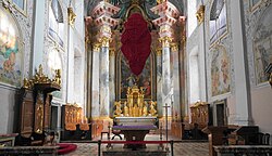 | Dom und Stadtpfarrkirche hll. Petrus und Paulus: Eine feuerrote Textilzunge, wurde als überdimensionales, abstrahiertes Fastentuch über dem Altar des Klagenfurter Domes installiert. Ina Loitzl zeigt sich vom Muskelkörper Zunge, "der sowohl Genuss als auch Ekel in sich birgt", fasziniert. | Eigenes Werk | Naturpuur | Datei:LINGUA sprachlos, Kunstinstallation (2023), Dom und Stadtpfarrkirche hl. Petrus und Paulus.jpg | |