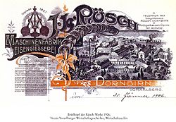| Briefkopf von 1906 der “Rüsch-Werke 1827-1984” in Dornbirn heutige Inatura | Verein Vorarlberger Wirtschaftsgeschichte, Wirtschaftarchiv | Rüsch Werke Uploaded by böhringer friedrich | Datei:BriefkopfRüschwerke.jpg | |