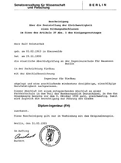 - ↑ Der Klammerzusatz (FH) ist zwingend. Beim an einer (Technischen) Universität erworbenen Diplom-Ingenieur wird gelegentlich zur Unterscheidung der freiwillige Klammerzusatz (TU) beziehungsweise (TH) verwendet.
