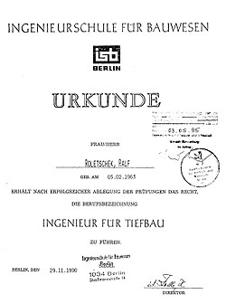 | Ingenieururkunde Neue Bundesländer Wendezeit | eigenes Zeugnis | kein Urheber (kein Werk) | Datei:Ing-ddr.jpg |