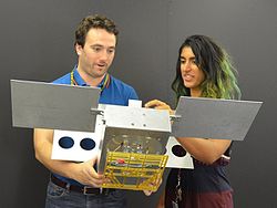 | Teams worked on the final processing of their payloads that will fly aboard Artemis I. Housed within the Orion stage adapter, the satellites – called CubeSats – are roughly the size of a large shoe box and weigh no more than 30 pounds. Despite their small size, they enable science and technology experiments that may enhance our understanding of the deep space environment, expand our knowledge of the Moon, and demonstrate new technologies that could be used on future missions. | https://images.nasa.gov/details-KSC-20210714-PH-KLS01_0066 | Kim Shiflett | Datei:Engineers and students pose for a photo in the SSPF.jpg | |