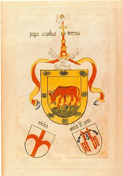 | Ingeram-Codex der ehemaligen Bibliothek Cotta pappa calixtus/tercius (Alonso de Borja 1378-1458, Papst 1455- 58) eclesia eclesia s(anc)ti petri | Die Wappenbücher Herzog Albrechts VI. von Österreich: Ingeram-Codex d. ehem. Bibliothek Cotta; hrsg. v. Charlotte Becher u. Ortwin Gamber; Wien; Köln; Graz; 1986. Jahrbuch der Heraldisch-Genealogischen Gesellschaft Adler; Folge 3, Bd. 12 Jg. 1984/85; ISBN 3-205-05002-9 | Hans Ingeram and a so called Exempla-master | Datei:Ingeram Codex 038.jpg | |