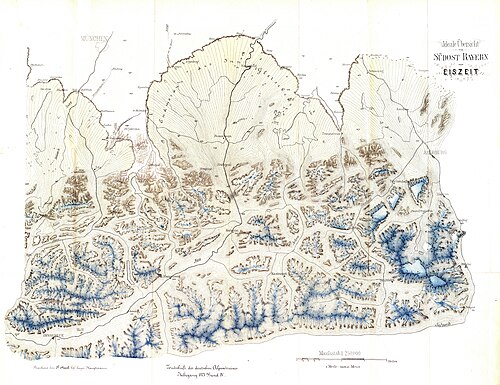 | Ideale Übersicht von Südost Bayern zur Eiszeit aus Zeitschrift des Deutschen und Österreichischen Alpenvereins Bd.04 (1873) | austrian literature online | F. Stark kgl. bayer. Hauptmann | Datei:Ideale Übersicht von Südost Bayern zur Eiszeit.jpg | |
