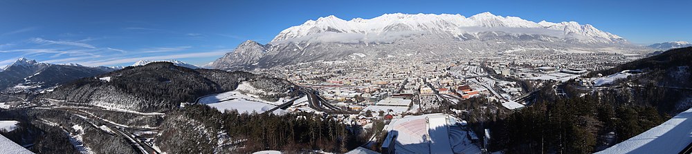 Das Gebiet der Stadt Innsbruck von West nach Ost erstreckt sich über einen großen Teil des Inntals, neben dem bebauten Talboden auch über viel Bergraum.