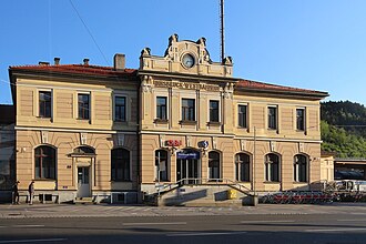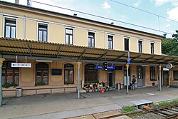 Das an der Egger-Lienz-Straße 1 gelegene Stationsgebäude wurde 1906/07 als zweigeschoßiger Bau mit Walmdach zu neun Frontachsen in späthistoristischen Formen mit Secessionsstilanklängen (sparsamer Dekor mit geometrischen Motiven und stilisierten Festons an Keilsteinen, Pilastern und dem Uhr-Aufsatz) errichtet.[1] Die drei mittleren Achsen sind als Risalit ausgebildet, wobei die Zentralachse verbreitert ist. Das Risalitobergeschoß ist mit einer Pilastergliederung sowie einem Kranzgesims versehen und wird von einer sockelgeschmückten Attika mit Uhr-Aufsatz bekrönt. Die Wandflächen weisen eine Nutung auf, die über den segmentbogigen Erdgeschoßöffnungen zu Keilsteinbekrönungen umgebogen ist. Die Fenster – soweit sie noch original erhalten sind – haben eine dreiteilige Sprossung und Kämpfer. Die Geschoßteilung erfolgt durch ein Kordongesims.