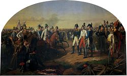 | Siegesmeldung des Fürsten Karl Philipp zu Schwarzenberg an die verbündeten Monarchen Zar Alexander I. von Russland, Kaiser Franz I. von Österreich und König Friedrich Wilhelm III. von Preußen (von links nach rechts) in bzw. nach der Völkerschlacht bei Leipzig am 19. Oktober 1813, Gemälde von Johann Peter Krafft (1780-1856). | selbst erstellt im Heeresgeschichtlichen Museum | Johann Peter Krafft | Datei:HGM Krafft Sigesmeldung bei Leipzig 1813.jpg | |