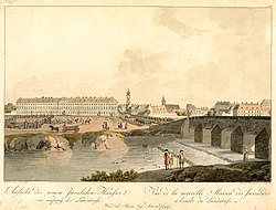 | Ansicht des neuen Invalidenhauses am anfang der Landstrasse. Kupferstich und Radierung, koloriert. Gestochen von J. Ziegler 1792. Nach der Natur gezeichnet von L. Janscha . Im Vordergrund der Wienfluss ; rechts neben dem Invalidenhaus die Landstraßer Hauptstraße mit der Elisabethinenkirche ; rechts davon im Hintergrund die Türme der Rochuskirche . | Witzmann et al., Schöne Aussichten | Laurenz Janscha, Johann Ziegler | Datei:Invalidenhaus Wien 1792.jpg | |