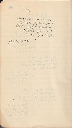 | כתב יד של שירו של איציק מאנגר "אונטער די חורבֿות" (II) | ארכיון איציק מאנגר, ARC. 4* 1357, הספרייה הלאומית (דרך ד"ר אפרת גל־עד) | איציק מאנגר (כתב יד) | Datei:Manuscript of Itzik Manger's Unter di Khurves II.jpg |