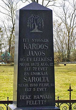 Im Jahre 1873 verstarb János Kardos 72-jährig in Hodos und wurde auf dem Friedhof seiner Pfarrgemeinde bestattet.